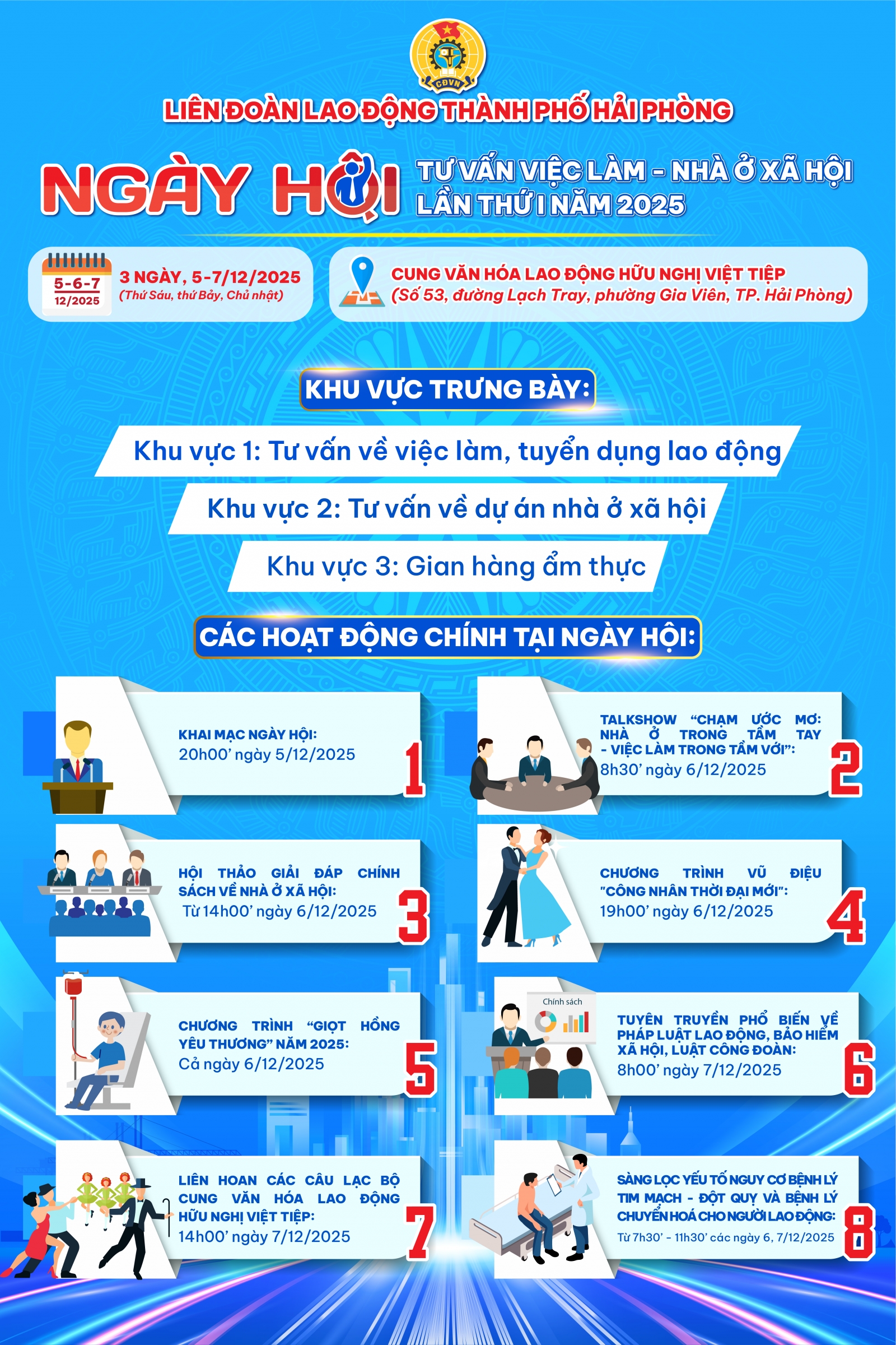 Liên đoàn Lao động thành phố Hải Phòng trân trọng kính mời các doanh nghiệp và đơn vị cùng chung tay tổ chức Ngày hội, lan tỏa thông điệp “Việc làm - Mái ấm - Hạnh phúc”, góp phần xây dựng môi trường lao động văn minh, giàu giá trị nhân văn cho cộng đồng lao động Hải Phòng.