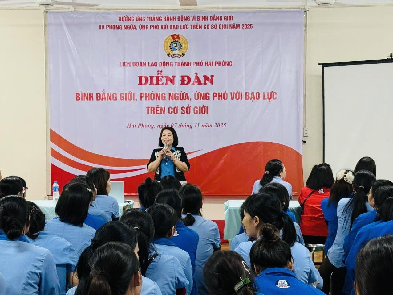 Hưởng ứng Tháng hành động vì Bình Đẳng giới và phòng ngừa, ứng phó với bạo lực trên cơ sở giới năm 2025, ngày 07 tháng 11 năm 2025, Liên đoàn Lao động thành phố Hải Phòng tổ chức Diễn đàn “Bình đẳng giới, phòng chống bạo lực trên cơ sở giới trong công nhân, lao động” tại Xí nghiệp May Hải Phòng - Chi nhánh Công ty Cổ phần Chế biến Xuất nhập khẩu Thủy sản Anh Minh.