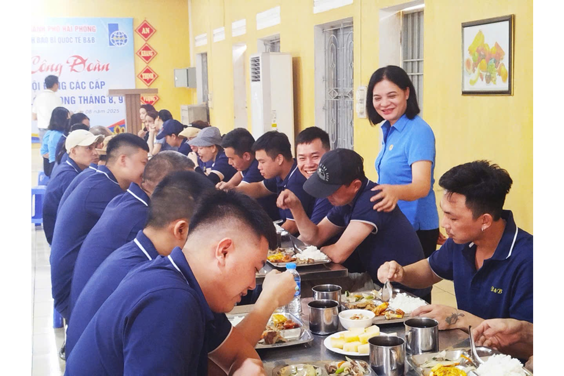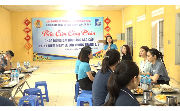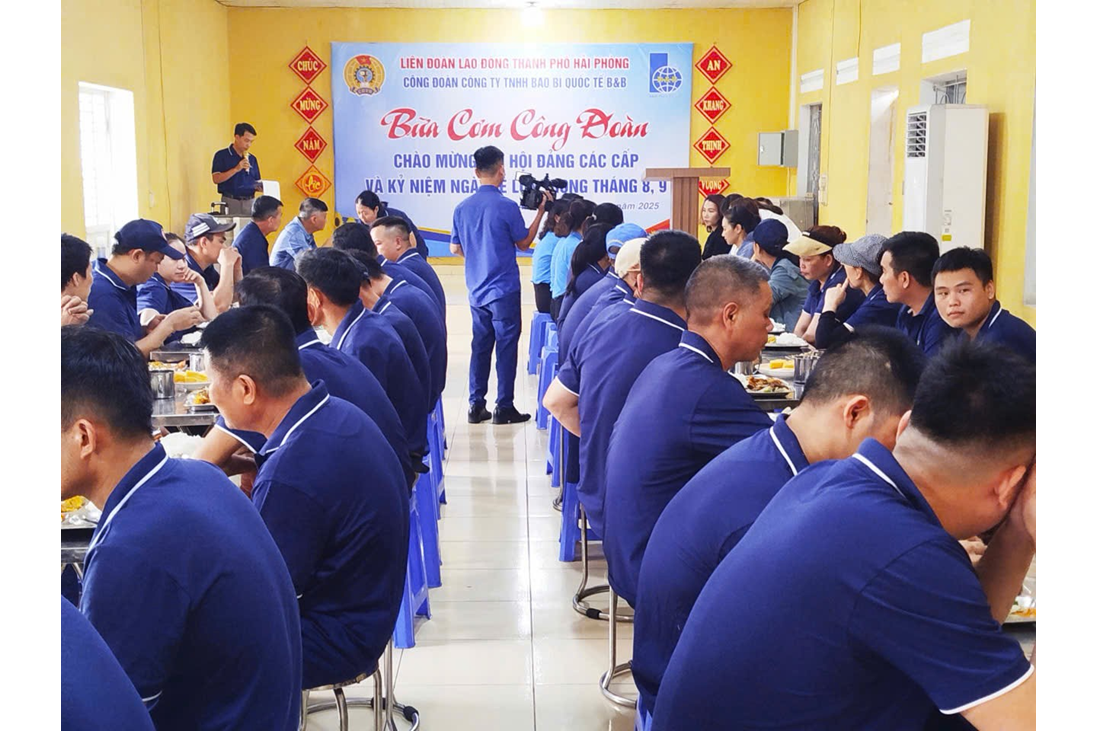Thực hiện Kế hoạch số 04/KH-LĐLĐ ngày 11/7/2025 của Ban Thường vụ Liên đoàn Lao động thành phố Hải Phòng về việc Triển khai tổ chức “Bữa cơm Công đoàn” năm 2025, trưa ngày 7/8, Công đoàn Công ty TNHH Bao Bì Quốc Tế B&B tổ chức “Bữa cơm Công đoàn” chào mừng Đại hội Đảng các cấp và các ngày lễ lớn trong tháng 8, tháng 9. Tới dự có đồng chí Lê Thị Thanh Thủy – Phó Chủ tịch Liên đoàn Lao động thành phố; đồng chí Trần Thị Phương – Ủy viên Ban Thường vụ Đảng ủy, Phó Chủ tịch UBND phường; các đồng chí Lãnh đạo Ban Công tác Công đoàn Liên đoàn Lao động thành phố; lãnh đạo Ủy ban MTTQ Việt Nam phường; các đồng chí Lãnh đạo, chuyên viên Công đoàn phường.