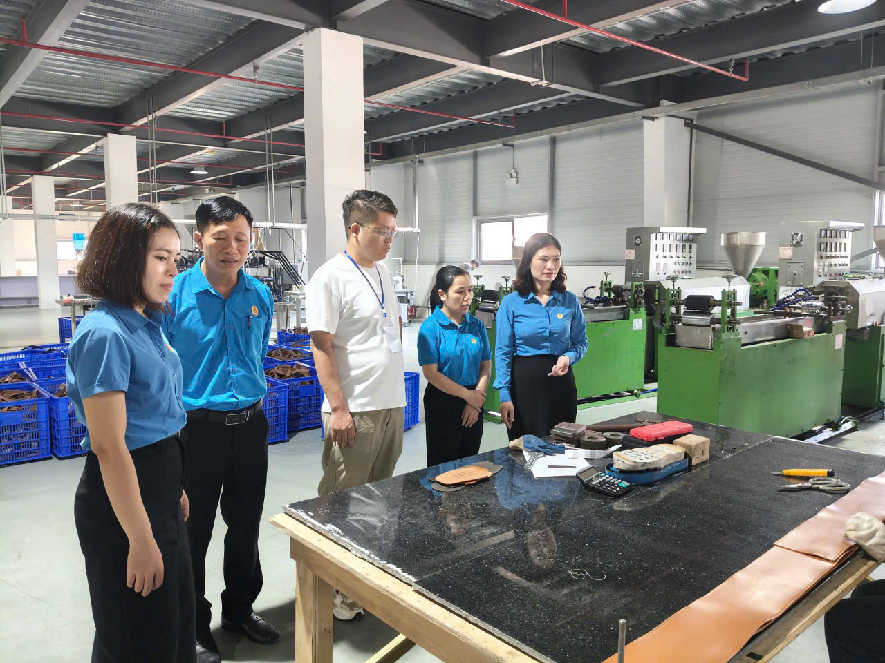 Lãnh đạo Công đoàn xã Tiên Lãng thăm điều kiện làm việc của người lao động tại công ty TNHH Công nghệ Vật liệu Giày Lệ Gia Việt Nam.